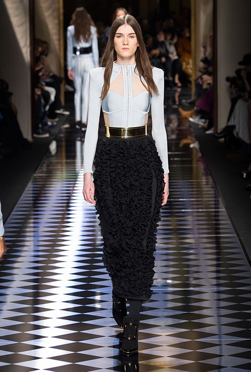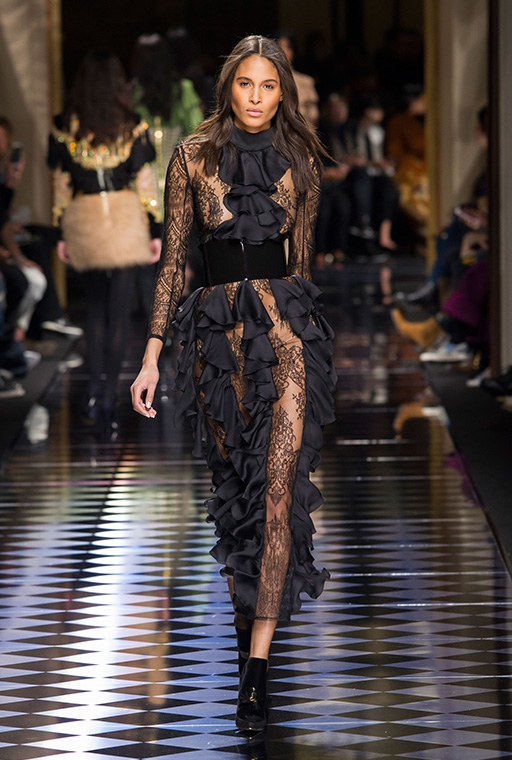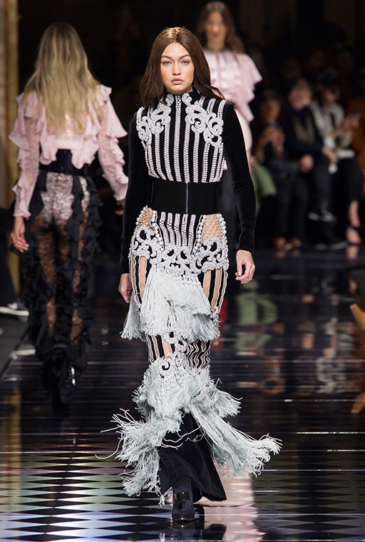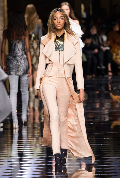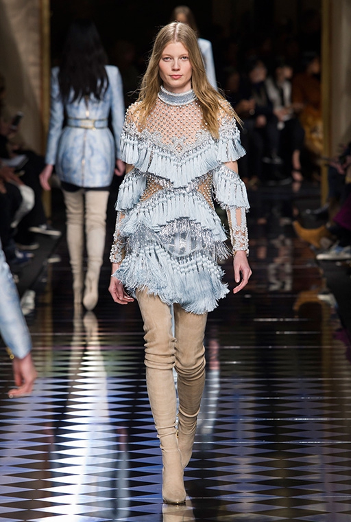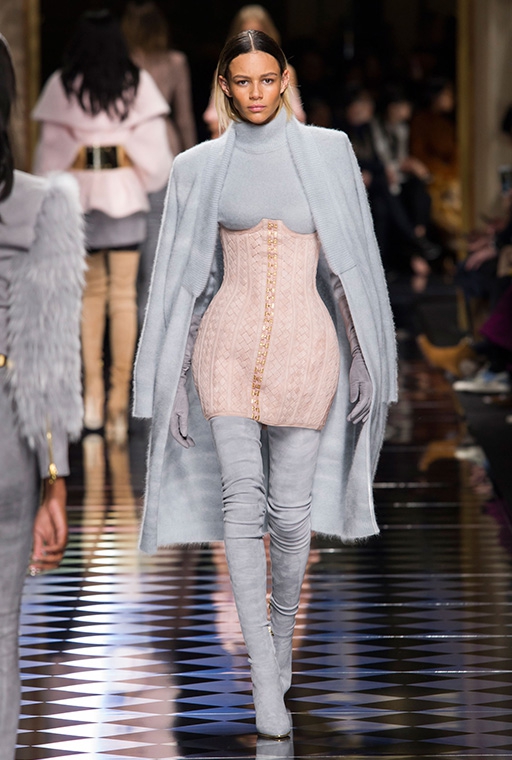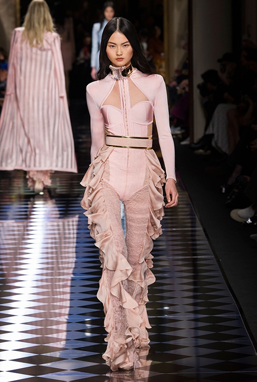 Od Olivijea Rustinga već smo navikli na snažne luksuzne kolekcije koje su uvijek dobro osmišljene od početka do kraja. Vjeran estetici modne kuće nema bitnog mijenjanja siluete, ona je još uvijek tipično Balmain – utegnuta u struku s korzetom, naglašenih ramena i vrlo uskih formi i krojeva. U novoj kolekciji oslonio se na prethodnu u kojoj se inspirisao erom dekadentnih zabava u bogatoj francuskoj istoriji. Ekstravagantni uzorci, sjajne resice, brokatni materijali ovog puta osvanuli su u pastelnim bojama, svijetloružičastoj, svijetloplavoj i tirkiznoj boji.