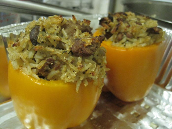 Paprike puniti smjesom, poređati u tepsiju, zaliti paradajzom da ogreznu i peći na umjerenoj temperaturi.