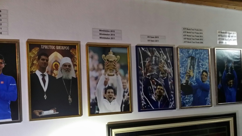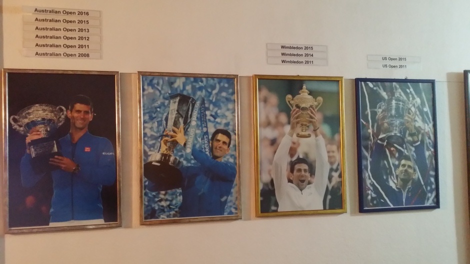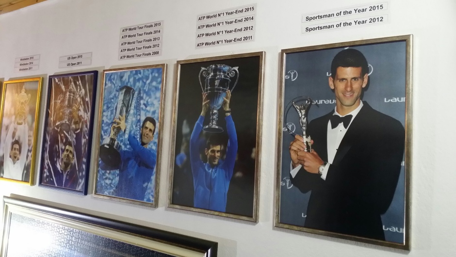 U ulaznom hodniku, naime, postavljene su uramljene fotografije najboljeg tenisera današnjice sa svim trofejima koje je osvojio u karijeri. Dominiraju naravno one sa grend slem turnira iznad kojih su uredno, slično kao u holu najpoznatijih teniskih arena, zavedene godine Novakovih trijumfa.