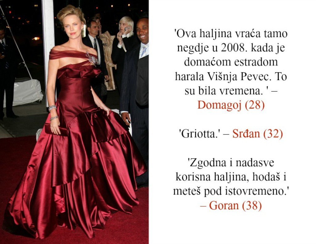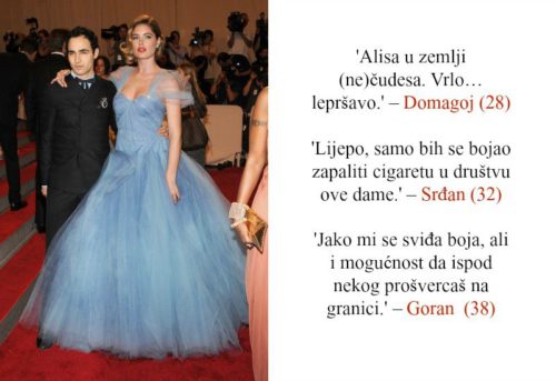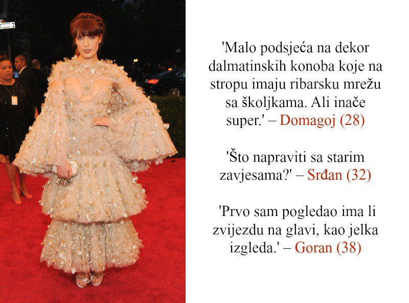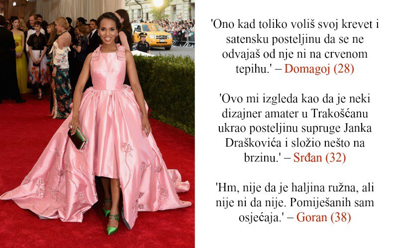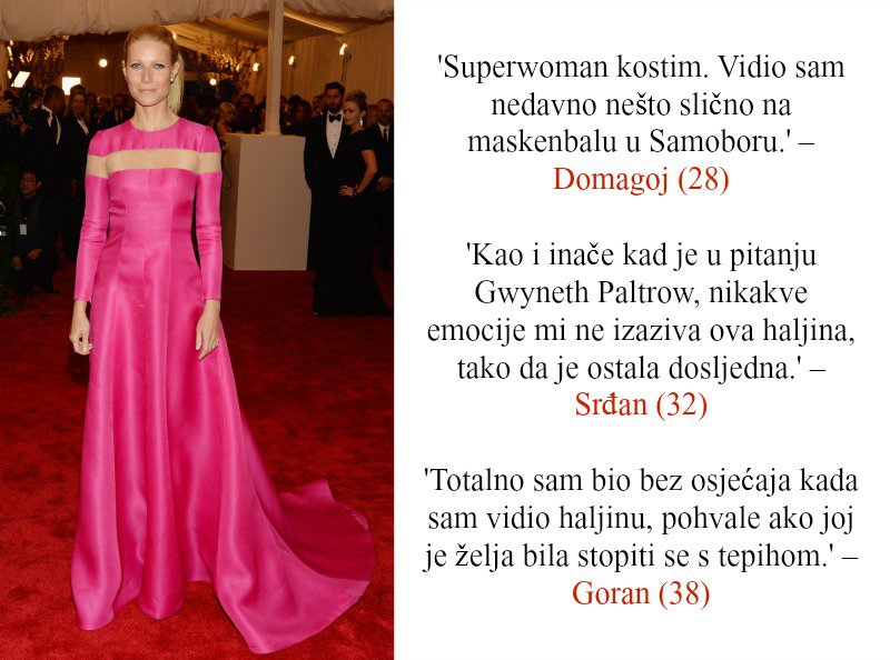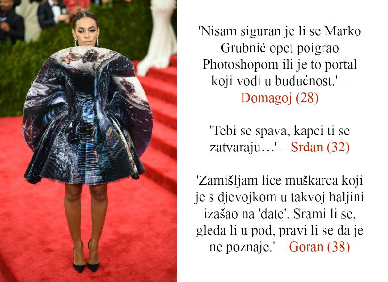 Odlučili smo ih pokazati posebnom modnom žiriju sastavljenom od troje muških kolega iz drugih redakcija. Predrasuda da se muškarci ne razumiju u modu s crvenog tepiha nego isključivo u fudbalske bravure s travnatog zelenog ,,tepiha” duboko je ukorijenjena u našem društvu.