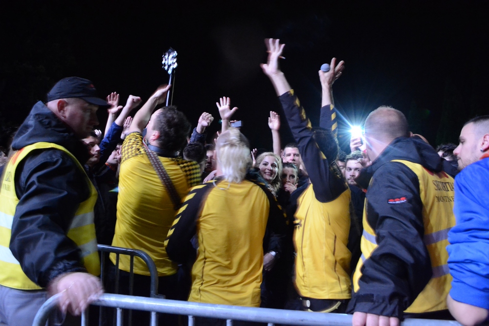 Predao se on, ali i publika divnim, veselim notama, pa su tako u jednom trenutku napravili ,,vozić” u pjesmi ,,Hir aj kam, hir aj go” i sjajno se zabavili, a gromko su aplaudirali i kada je Magnifico u najavi numere ,,Ja Mustafa” rekao: ,,Dolazim iz Ljubljane. Mi smo oni šupci što su postavili ogradu za izbjeglice. Ja se veoma stidim što dolazim iz takve zemlje. ,,Ja Mustafa” posvećujem Mustafama svih boja i vjera.”, kao i kada je čestitao deset godina državnosti uz pozdrav ,,hiljadu godina još da slavite, pa kad se slavi, nek se slavi” i zapjevao ,,Evo me narode”. Pjevali su onako od srca, meraklijski ,,Pukni zoro” i potvrdno uglas odgovorili na pitanje da znaju oni Magnificovog kuma Antonija Pušića prije nego što je slovenački muzičar zapjevao ,,Pismo kumu (Rambo, rambo)”.