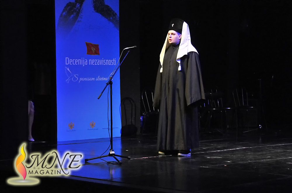 Učenik OŠ ,,Vojin Popović” iz Drezge, uz pratnju učenika OŠ ,,Vladimir Nazor” odrecitovao je Njegoševu ,,Poslanicu Crnogorcima”, a onda je na scenu stupio učenik Srednje stručne škole ,,Spasoje Raspopović” koji je izrekao ,,Poslanicu Crnogorcima i Brđanima”.