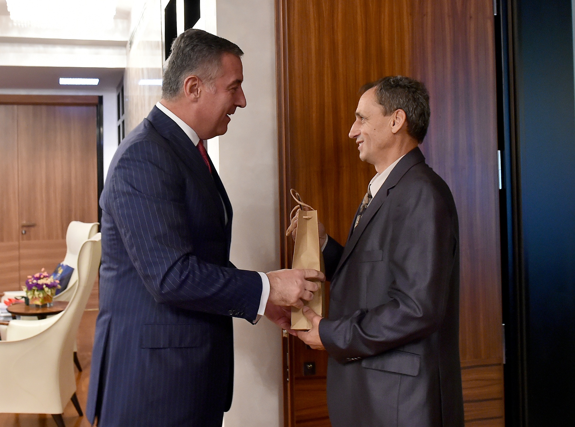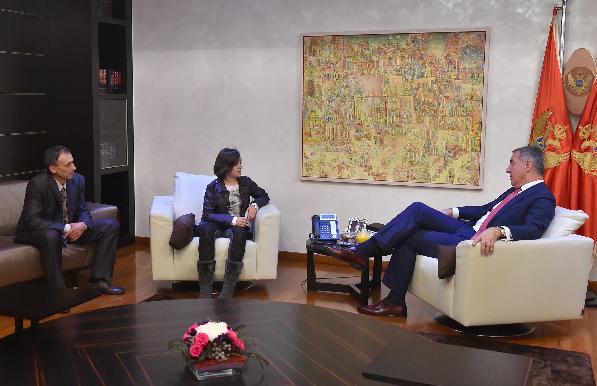 Premijer je uručio Tari jedan od prvih primjeraka kovanog novca koji je Centralna banka Crne Gore izdala povodom deset godina obnove nezavisnosti, a ona njemu svoj pismeni sastav „Crna Gora, moja domovina“.