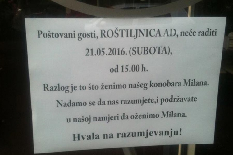 U vrijeme kada su međuljudski odnosi sve gori, a naročito odnosi na relaciji poslodavac – radnik, jedan svjetao primjer u Banjaluci, pišu Nezavisne novine. Vlasnik jedne roštiljnice u Banjaluci je odlučio da u proteklu subotu zatvori vrata svog lokala kako bi svi radnici s njim na čelu prisustvovali vječanju jednog od zaposlenih.