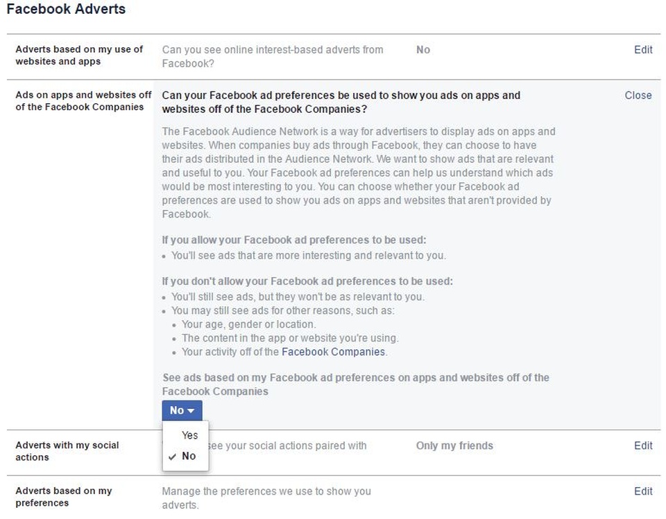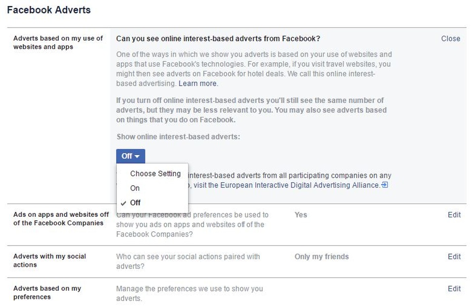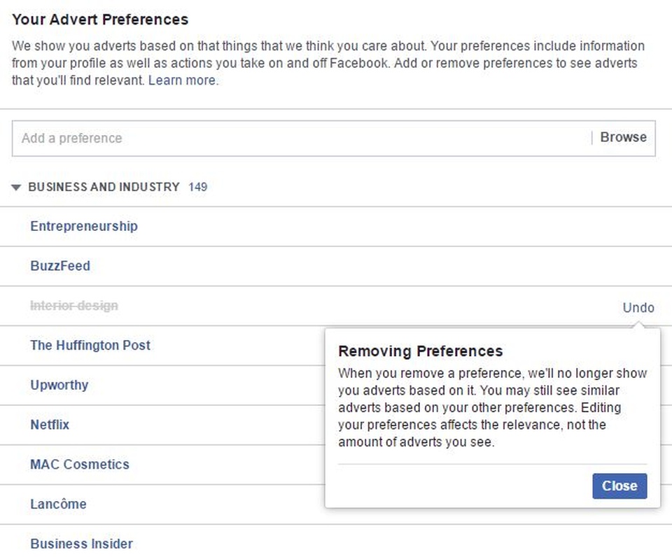 Pod ,,Advert Preferences” moraćete isključiti svaku kategoriju posebno kako bi onemogućili prikazivanje ciljanih oglasa.