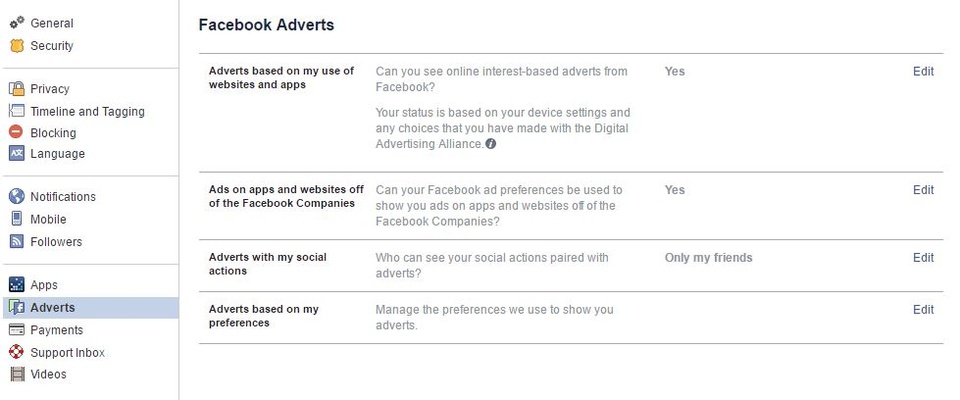 Otiđite na postavke vašeg ,,Facebook” profila i odaberite ,,Adverts” (ili Ads). Ondje ćete vidjeti četiri opcije za odabir postavki vezanih za oglase.