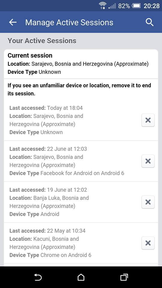 Dakle, sve što trebate uraditi jeste otvoriti opciju Settings, zatim Security, a potom Where You're Logged In (ili Managed active sessions) i tako ćete vidjeti s kojih IP adresa ste trenutno logovani na Facebook.