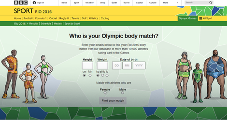 Saznajte koja ste sportska zvijezda sa ovogodišnjih Olimpijskih igara u Brazilu. Jednostavno ukucajte svoju težinu, visinu i pol, datu rođenja i otkrijte koji sport je kao stvoren za vašu tjelesnu građu.