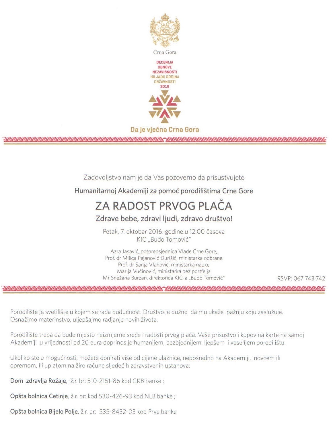 Humanitarna akademija za pomoć porodilištima Crne Gore pod nazivom ,,Za radost prvog plača – zdrave bebe, zdravi ljudi, zdravo društvo” biće organizovana sjutra u Velikoj sali Kulturno – informativnog centra ,,Budo Tomović”, sa početkom u 12 sati.