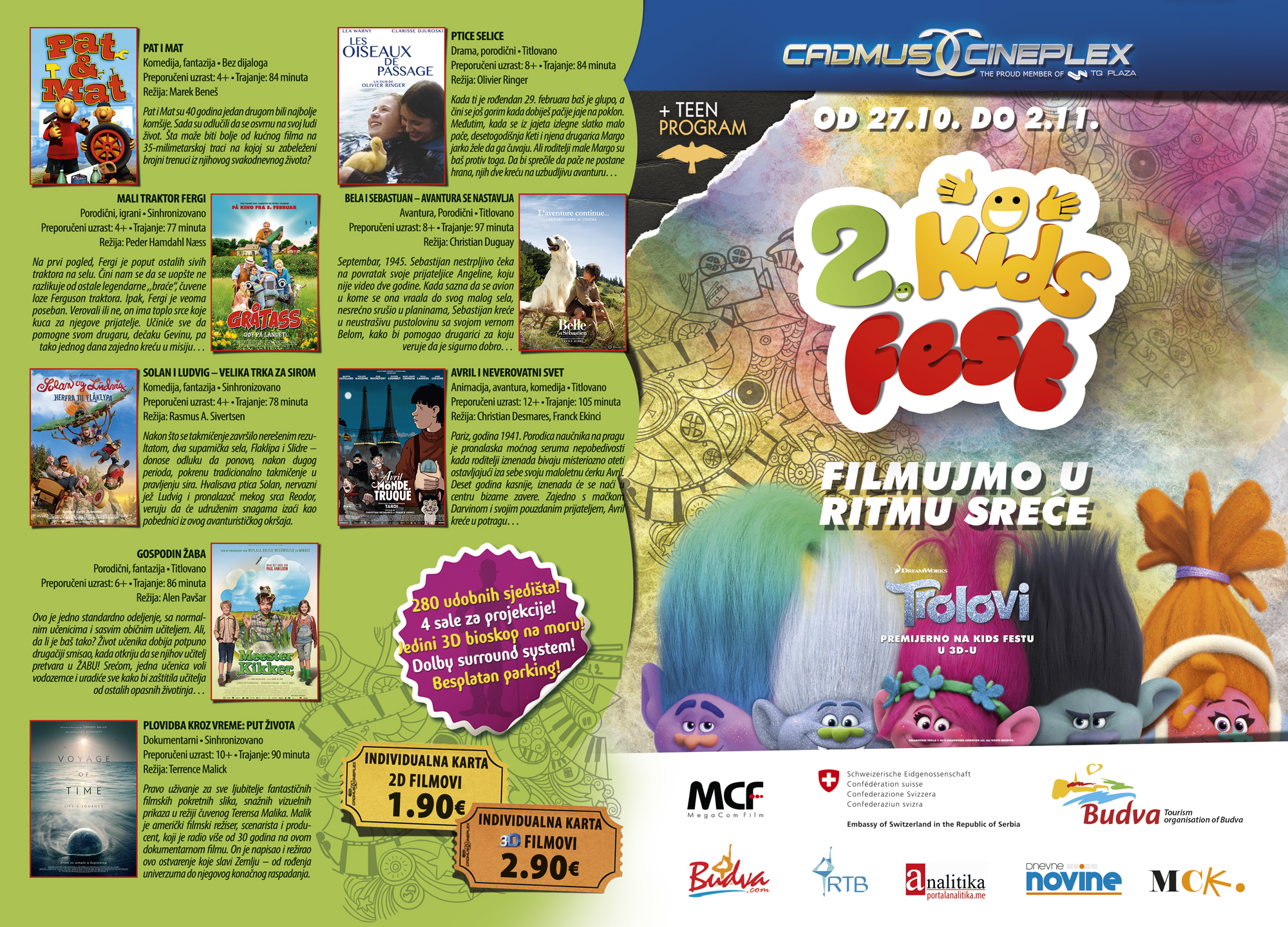 U okviru KIDS programa, biće prikazani nastavak vrlo uspješnog filma ,,Bela i Sebastijan”, ,,Čudovištvance Moli”, priča o nekada najboljim komšijama film ,,Pat i Mat”, zatim jedan od najgledanijih filmova svih vremena ,,Ledeno doba: Veliki udar”, kao i najnoviji film Dreamworks Animation ,,Trolovi”.