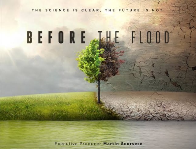 ,,Before the Flood” (,,Prije Potopa”) je dokumentarni film Fišera Stivensa koji prati Leonarda Dikaprija kroz tri godine ličnog dnevnika slavnog glumca, od slike iz djetinjstva koja mu je zauvijek ostala u umu, preko imenovanja U.N. Glasnika mira, snimanja Inarituovog ,,Povratnika”, razgovora sa Ban Ki-Munom, Barakom Obamom i osobama iz svih sfera života. Cilj je da se spriječi katastrofa globalnog zagrevanja koja nam je jako blizu.