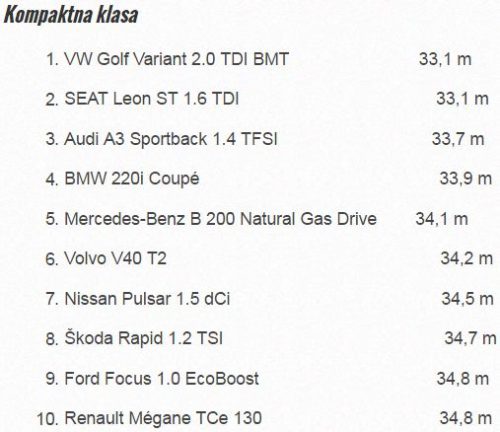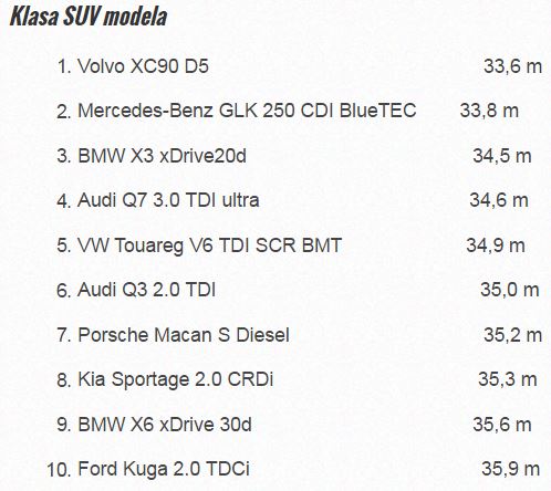 Njemački autoklub ADAC pri testiranju novih modela automobila obavezno ispituje kočnice u identičnim uslovima. Tako ADAC mjeri put kočenja (100-0 km/h) automobila s fabričkim letnjim gumama na suvom putu. U posljednje četiri godine ADAC je testirao oko 500 novih modela, a ovih dana sumirali su sve rezultate i objavili ih po klasama. Čitavoj priči treba da se doda i marka, tip i vrsta automobila da bi bilo jasnije zašto je najkraći put kočenja imao sportski ,,porsche 911 carrera cabriolet” (31,3 metra), a najduži dostavni ,,citroen jumper combi” (47,8 metara). Što u praksi znači da u trenutku kada se ,,porsche 911 carrera” zaustavi, ,,jumper” se još kreće brzinom od 55 km/h. Raduje činjenica da sve više modela ima kratak put kočenja – bez obzira na cijenu, veličinu i težinu automobila. Tako su jako blizu skupog ,,porsche”-a i ,,mini one” D (32,7 metara), ,,VW golf variant” (33,1 metar), ali i 2,3 tone teški ,,mercedes-benz s 500” (32,6 metara). Još jedan važan podatak koji moraju svi vozači da znaju: put kočenja raste kvadratno proporcionalno u odnosu na brzinu. Drugim riječima: dvostruko viša brzina produžava put kočenja četiri puta.