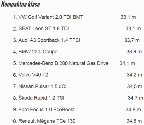 Njemački autoklub ADAC pri testiranju novih modela automobila obavezno ispituje kočnice u identičnim uslovima. Tako ADAC mjeri put kočenja (100-0 km/h) automobila s fabričkim letnjim gumama na suvom putu. U posljednje četiri godine ADAC je testirao oko 500 novih modela, a ovih dana sumirali su sve rezultate i objavili ih po klasama. Čitavoj priči treba da se doda i marka, tip i vrsta automobila da bi bilo jasnije zašto je najkraći put kočenja imao sportski ,,porsche 911 carrera cabriolet” (31,3 metra), a najduži dostavni ,,citroen jumper combi” (47,8 metara). Što u praksi znači da u trenutku kada se ,,porsche 911 carrera” zaustavi, ,,jumper” se još kreće brzinom od 55 km/h. Raduje činjenica da sve više modela ima kratak put kočenja – bez obzira na cijenu, veličinu i težinu automobila. Tako su jako blizu skupog ,,porsche”-a i ,,mini one” D (32,7 metara), ,,VW golf variant” (33,1 metar), ali i 2,3 tone teški ,,mercedes-benz s 500” (32,6 metara). Još jedan važan podatak koji moraju svi vozači da znaju: put kočenja raste kvadratno proporcionalno u odnosu na brzinu. Drugim riječima: dvostruko viša brzina produžava put kočenja četiri puta.