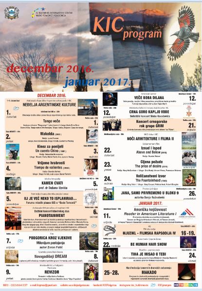 Poštujući dosadašnji kontinuitet i kvalitet kulturnih događaja, Kulturno – informativni centar ,,Budo Tomović” tokom decembra i januara 2017. godine prirediće brojne atraktivne programske sadržaje.
