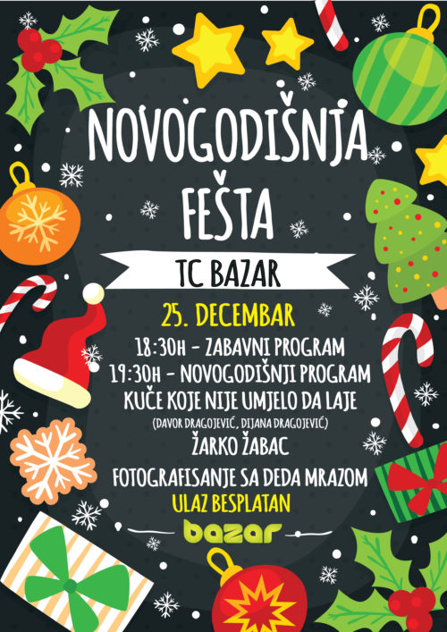 U susret Novoj godini tržni centar Bazar je i ove godine za vas pripremio Novogodišnju feštu koja će biti održana 25. decembra sa početkom u 18:30h.