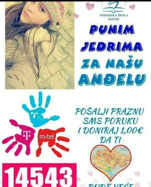 Uz poruku ,,Punim jedrima za Anđelu”, Srednja pomorska škola je u saradnji sa Ministarstvom prosvjete Crne Gore i mobilnim operaterima obezbijedila specijalan broj 14543 na koji će svi ljudi velikog srca, izražene humanosti moći poslati praznu SMS poruku po cijeni od 1€, saopšteno je preko Facebook stranice Podgoričkog vremeplova.