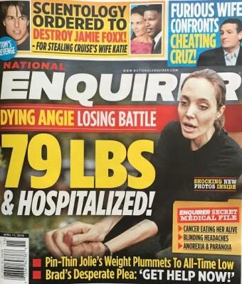 Magazin ,,National Enquirer” objavio je priču kako je glumica Anđelina Džoli hitno hospitalizovana zbog lošeg zdravstvenog i fizičkog stanja u kojem se nalazi i naveo da je smršala i ima svega 34 kilograma