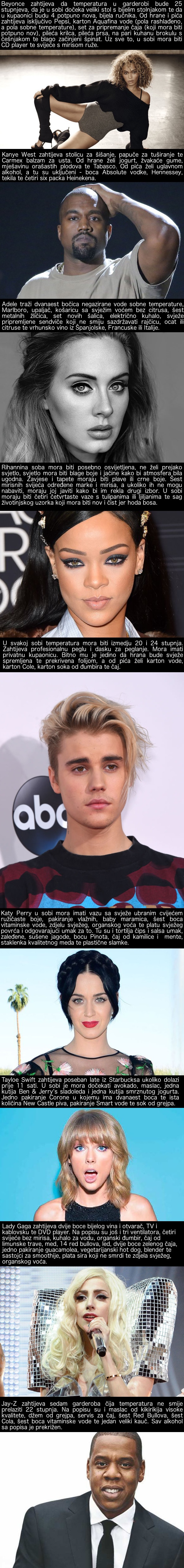 Hrvatski portal Index sastavio je listu zahtjeva koje neke od najpoznatijih zvijezda današnjice imaju za organizatore svojih koncerata širom svijeta. Određena sobna temperatura, peškiri, svijeće, specifična ishrana, stolica za šišanje, pegla, samo su neki od njih.