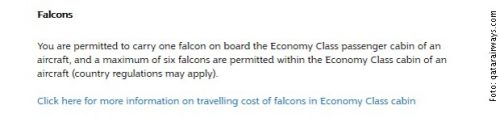 U pravilniku „Katar ervejsa“ postoji poglavlje koje se odnosi baš na sokolove. Ono je navedeno na zvaničnom sajtu, na stranici koja se odnosi na životinje i ljubimce: ,,U kabinu ekonomske klase možete unijeti jednog sokola, a maksimalno šest ptica može da boravi u toj kabini (lokalni propisi transfer zemalja se primenjuju)”.
