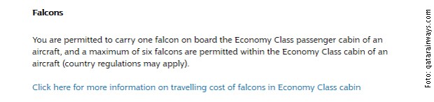 U pravilniku „Katar ervejsa“ postoji poglavlje koje se odnosi baš na sokolove. Ono je navedeno na zvaničnom sajtu, na stranici koja se odnosi na životinje i ljubimce: ,,U kabinu ekonomske klase možete unijeti jednog sokola, a maksimalno šest ptica može da boravi u toj kabini (lokalni propisi transfer zemalja se primenjuju)”.