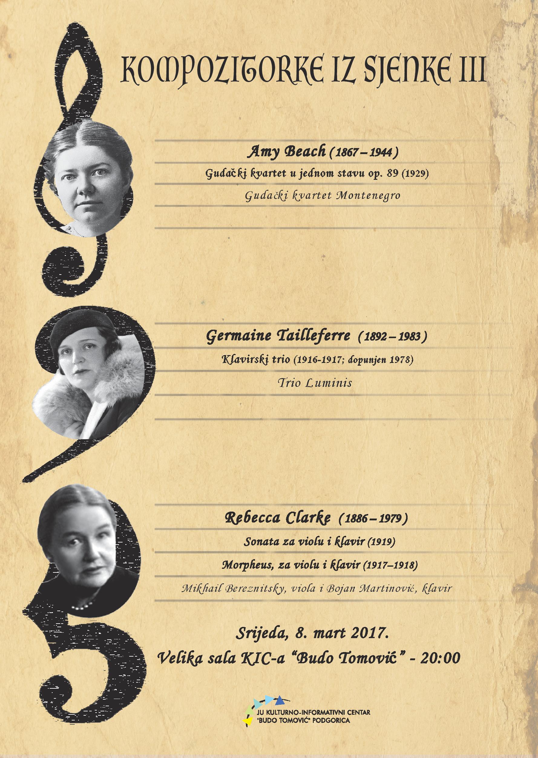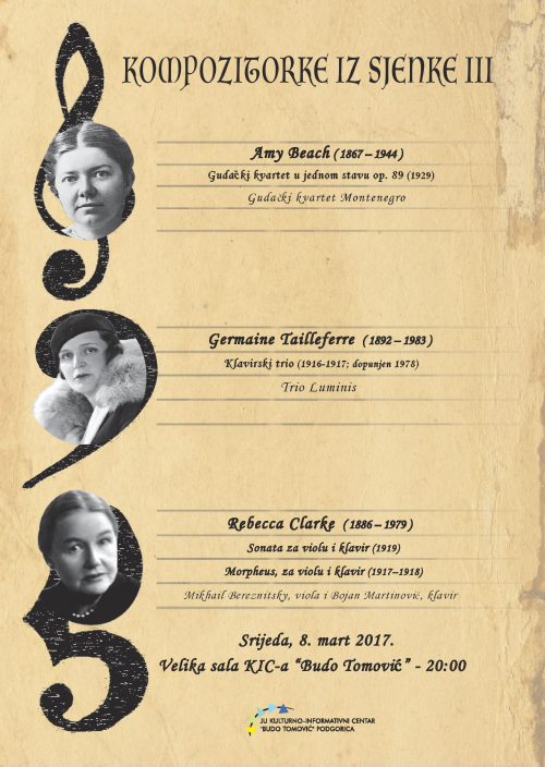 Djela kompozitorki Ejmi Bič (gudački kvartet op. 89), Žermen Tajfer (klavirski trio) i Rebeke Klark (Sonata za violu i klavir) izvešće gudački kvartet ,,Montenegro”, trio ,,Luminis” i duo violista Mihail Bereznitski i pijanista Bojan Martinović, u srijedu, 8.marta, u Velikoj sali KIC-a, sa početkom u 20 sati. Ulaz je besplatan.