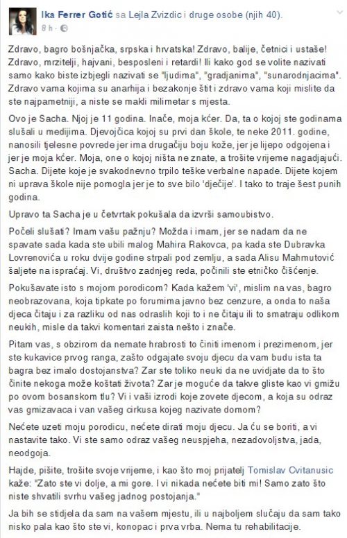 Ika Ferrer-Gotić, novinarka BHRT-a, objavila je na Facebook-u šokantan status u kojem navodi da je njena 11-godišnja kćerka pokušala izvršiti samoubistvo.
