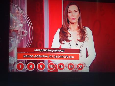 Dobitna kombinacija 1, 8, 9, 10, 16, 19, 28 donijela je srećnom dobitniku tačno 147.221.447,50 dinara, a tiket je uplaćen u Mladenovcu. Šest podgodaka imalo je devet igrača i osvojili su po 286.232 dinara, dok je pet pogodaka imalo njih 516 (4.992 dinara).