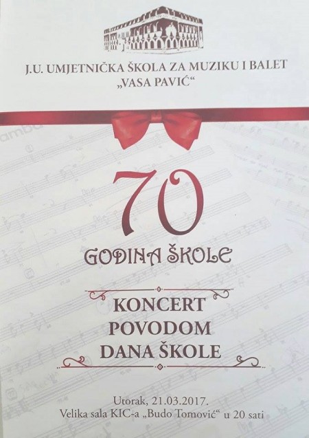 U okviru obilježavanja 70 godina postojanja Umjetnička škola za muziku i balet “Vasa Pavić” prirediće večeras koncert vokalne i instrumentalne muzike u Velikoj sali KIC-a, sa početkom u 19 sati.