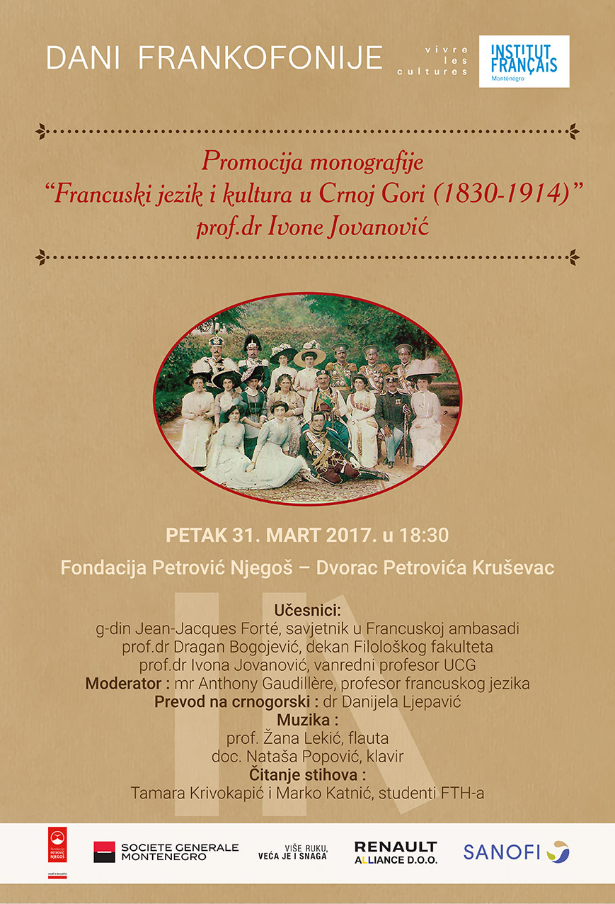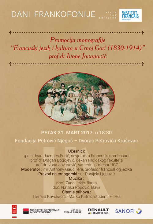 U okviru posljednjeg dana manifestacije Dani frankofonije, u petak, 31. marta u 18.30, biće održana promocija knjige profesorice Ivone Jovanović, pod nazivom ,,Francuski jezik i kultura u Crnoj Gori (1830-1914)”.