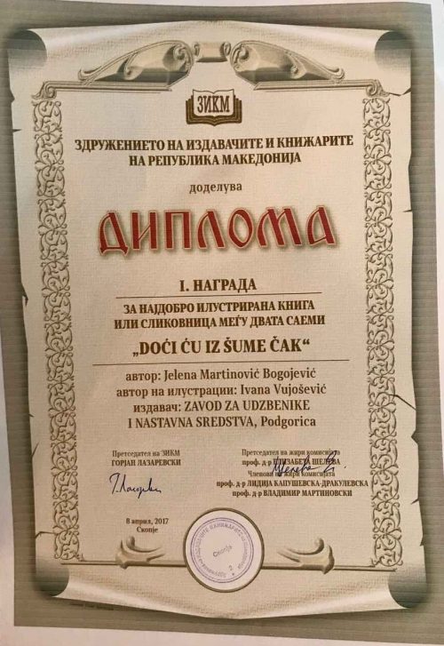 Izdanje „Doći ću iz šume čak”, autorke Jelene Martinović – Bogojević, koje je ilustrovala Ivana Vujošević , dobilo je prvu nagradu u kategoriji Najbolje ilustrovana knjiga ili slikovnica između dva sajama.