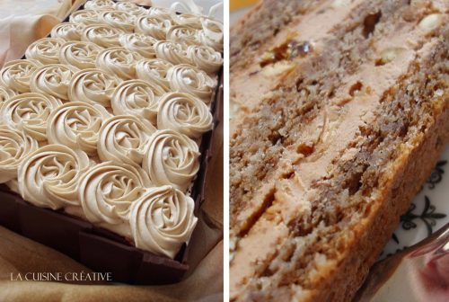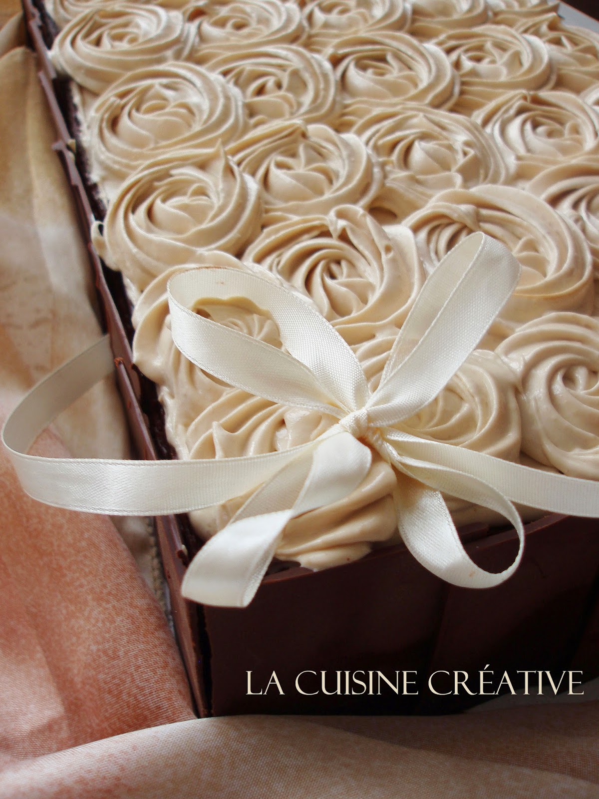 Tortu premažite filom sa svih strana u tankom sloju, a zatim zalijepite pločice tako da se djelimično preklapaju. Umutite šlag uz dodatak nes kafe i špricem sa zvezdastim nastavkom napravite ružice na vrhu. 🙂