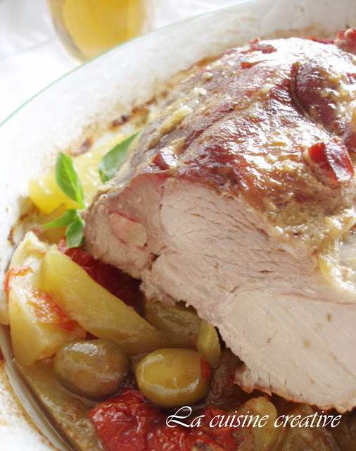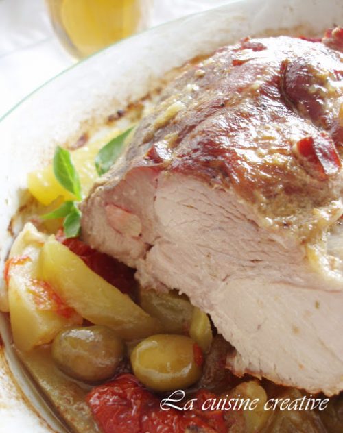 Sastojci: oko 1,7 kg svinjskog vrata u komadu (bez kostiju), 1 kg mladog krompira, 3 dl svijetlog piva, 2 paradajza, 3 dl mjesne supe, 70 g senfa, 50 g pančete, 6-7 režnjeva bijelog luka, 2 grančice ruzmarina, 1 glavica crnog luka, 50 g zelenih punjenih maslina, so, biber