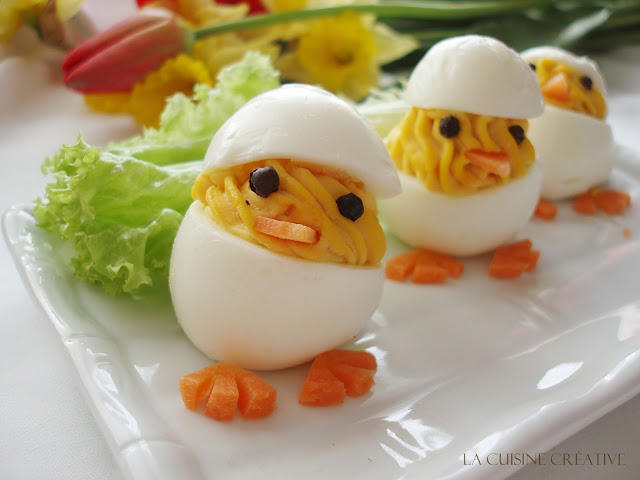 Od svježe šargarepe isjecite male trouglove za kljun, a nekoliko kolutića zasjecite kao lepezu za nožice. Oči napravite od maslina ili bibera u zrnu. Sve lijepo servirajte na tanjiru i čuvajte na hladnom do posluženja. 🙂