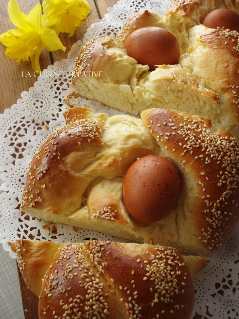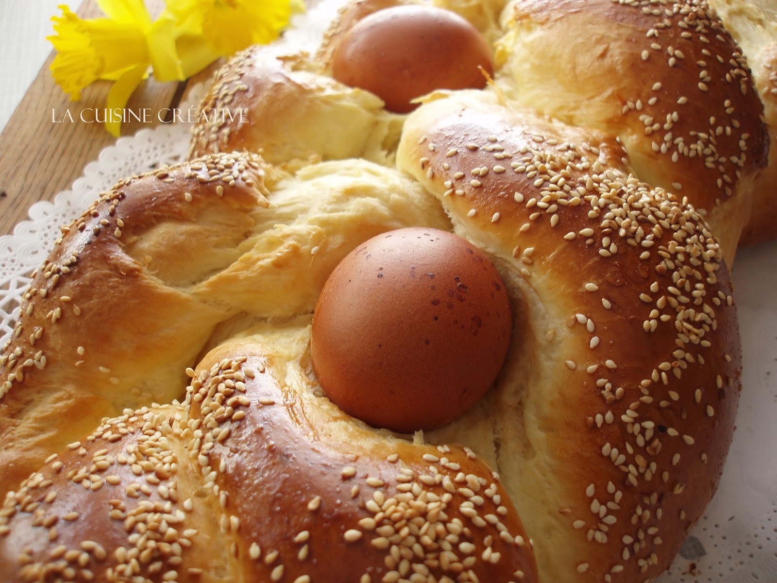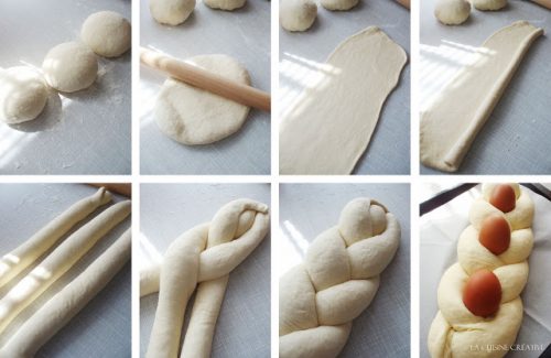 Tijesto podijelite na 3 dijela i oblikujte loptice. Poslije kraćeg odmaranja, svaku lopticu razvijte u pravougaonu koru i zavijte kao rolat. Upletite pletenicu od rolatića. Prebacite u pleh i napravite 4 udubljenja u koja ćete rasporediti prethodno skuvana uskršnja jaja.