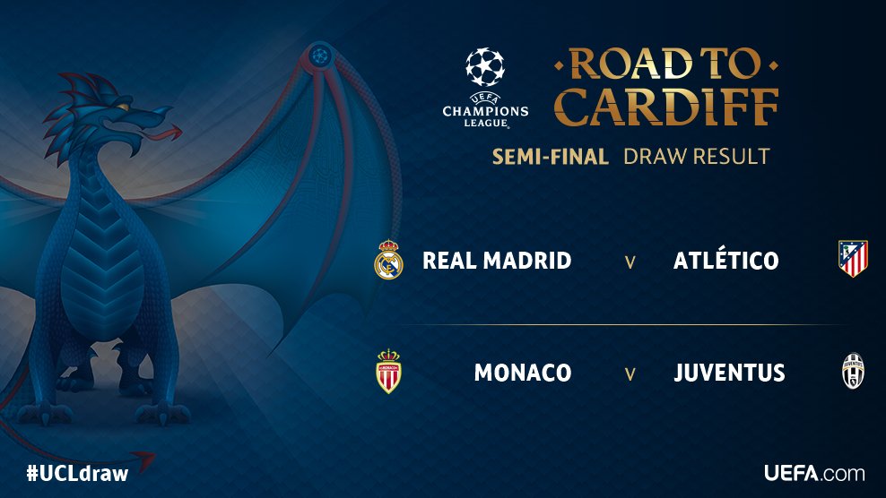 Prve utakmice polufinala su 2. maja kada igraju Real i Atletiko i 3. maja, kada se sastaju Monako i Juventus. Revanši su 9. maja (Juventus-Monako) i 10. maja (Atletiko-Real). Finale je 3. juna u Kardifu.
