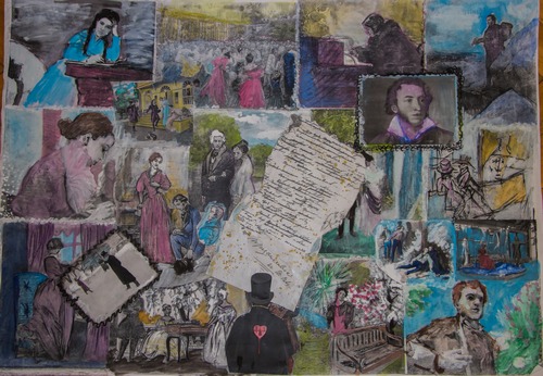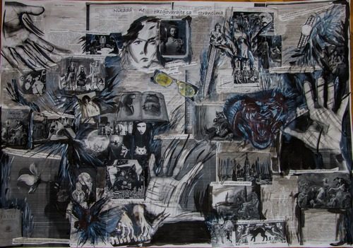 Da podsjetimo, tokom nastavne 2015/2016. godine u želji da podstakne učenice i učenike prvog i trećeg razreda da svoj doživljaj književnog djela vizuelno izraze, profesor je pokrenuo proces izrade kolaža koji su nastali od crteža, fotografija i isječaka iz novina. Izložba šesnaest radova otvorena je maja 2016. u prostorijama Fondacije Petrović Njegoš i u novembru 2016. godine u Knjižari ,,Karver”.
