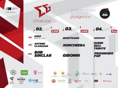 Ovogodišnji City Groove festival biće održan na podgoričkom Stadionu malih sportova od 2. do 4. juna. Prvog festivalskog dana publika će imati priliku da po prvi put u Podgorici uživa u nastupima francuskih DJ-eva i producenata Bob Sinclara i Antoine Clamarana, dok će im domaća podrška biti crnogorski DJ Cule iz organizacije Beat At Joe's.