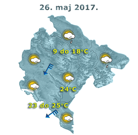 U južnim i centralnim predjelima Crne Gore danas će biti promjenljivo oblačno sa sunčanim intervalima i uglavnom suvo vrijeme, a na sjeveru umjereno do potpuno oblačno, mjestimično slaba kiša, a ponegdje moguć i kratkotrajan pljusak.