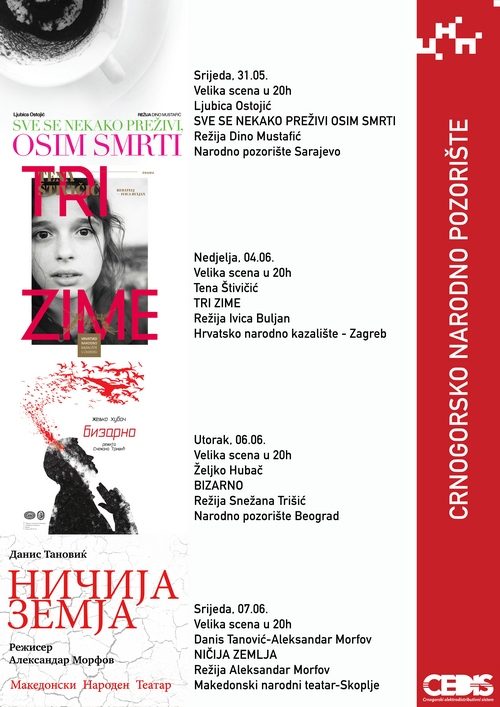 Narodno pozorište iz Sarajeva gostovaće u srijedu 31. maja na Velikoj sceni CNP-a u 20 sati, sa predstavom „Sve se nekako preživi osim smrti“, Ljubice Ostojić, u režiji Dina Mustafića.