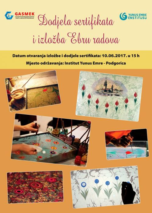 Kurs Ebru umjetnosti trajao je u periodu od aprila do juna 2017. i organizovan je u saradnji Instituta Yunus Emre Podgorica i odsjeka za kulturu i stručno obrazovanje opštine Gaziantep ( GASMEK ).