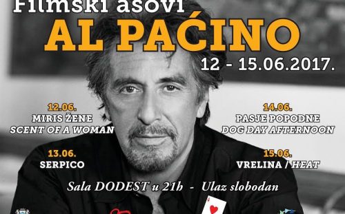 Film “Miris žene” sa kojim je Al Paćino osvojio 1992. nagradu “Oskar” otvoriće filmski ciklus u ponedjeljak, 12. juna, a za naredna tri dana predviđena je projekcija sljedećih filmova: 13. jun – “Serpico” (1973), 14. jun – “Pasje popodne” (1975) i 15. jun – „Vrelina” (1995).