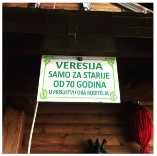 Naime, na vratima jednog restorana osvanuo je natpis koji zasigurno do suza zasmijao svakog gosta. “Veresija samo za starije od 70 godina, u prisustvu oba roditelja”, piše na ulazu u restoran.