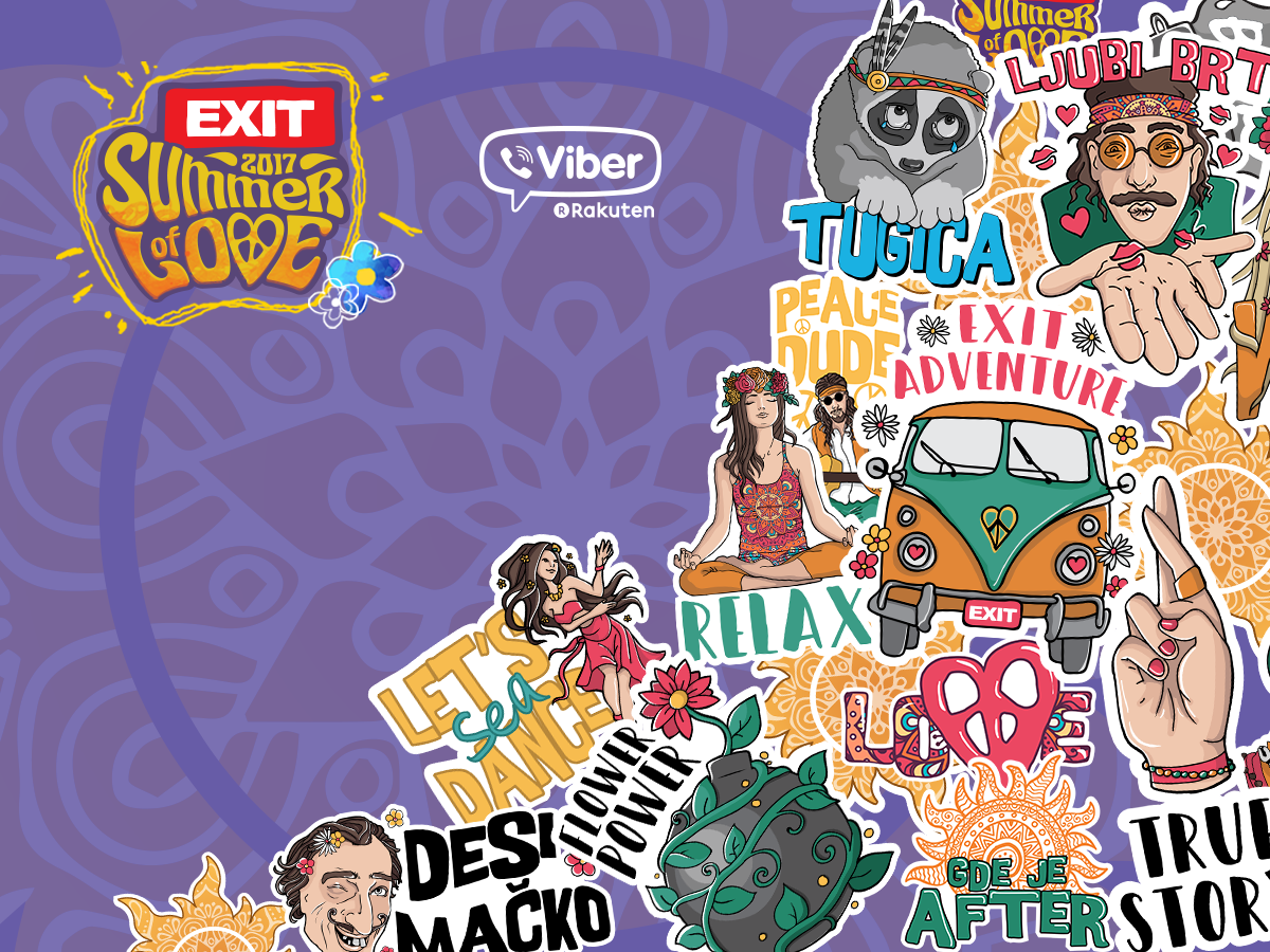 Nakon velikog uspjeha prošlogodišnjih EXIT Avantura stikera koji su za godinu dana razmijenjeni nevjerovatnih 15 miliona puta, EXIT i Sea Dance u saradnji sa Viberom izdaju novi paket stikera u čast 50. godišnjice velikog Ljeta ljubavi 1967. Revolucionarni hipi pokret koji je zauvijek promijenio svijet nastao je prije pola vijeka, a prepoznatljivi flower power i univerzalna poruka mira i zajedništva pretočeni su u dizajn stikera koji pozivaju na ljubav, druženje, avanturu, muziku i igru. Ove godine, fanovi oba festivala širom svijeta poslali su oko 3.000 kreativnih ideja za nove stikere putem Viber javnog naloga (prijavi se putem ovog linka). Pratioci festivala su na Viberu izabrali tri najbolje i njihove ideje su uključene u konačni hipi-paket koji sadrži 23 stikera koji su dostupni dvojezično! EXIT i Sea Dance su među najpopularnijim svjetskim brendovima na Viberu, sa oko 1,1 miliona pratilaca iz 174 zemlje.
