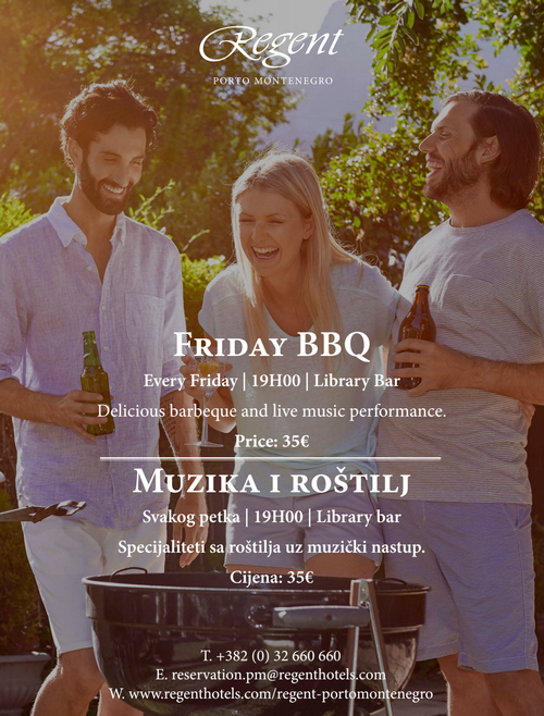 Svakog petka, počev od narednog, 30. juna, u Library baru hotela Regent Porto Montenegro goste očekuje dobra zabava pod nazivom Friday BBQ,uz specijalitete sa roštilja i muzički nastup.