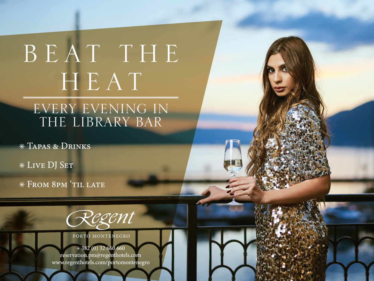 Žurka Beat the Heat će biti aktuelna svake večeri u Library baru hotela Regent Porto Montenegro, od 20 h do 01 h, osim petkom, kada će biti organizovan Friday BBQ.