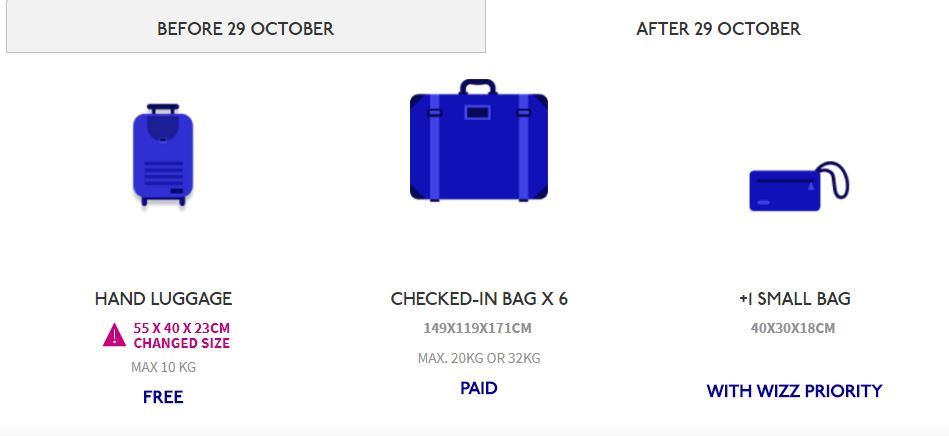 Putnici aviokompanije Wizz Air od 29. oktobra neće plaćati doplatu za unošenje u putničku kabinu ručnog prtljaga većih dimenzija na svim letovima, saopštila je danas ta kompanija.