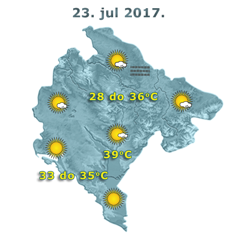 – Pretežno sunčano veoma toplo i sparno. Ujutru po kotlinama kratkotrajno magla, poslijepodne u kontinentalnim predjelima slab do umjeren razvoj oblačnosti, ali uglavnom suvo. Vjetar slab do umjeren, južni i zapadni. Jutarnja temperatura vazduha od 11 do 23, najviša dnevna od 28 do 39 stepeni. Podgorica: Sunčano i veoma toplo, poslijepodne slab do umjeren razvoj oblačnosti. Vjetar slab do umjeren južni. Jutarnja temperatura vazduha oko 23, najviša dnevna do 39 stepeni – sjutrašnja je prognoza Hidrometeorološkog zavoda Crne Gore.