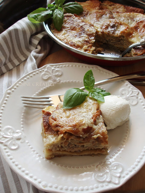 Pripremite nadjev, na malo ulja propržite sitno sjeckani crni luk da postane staklast. Dodajte mljeveno meso i začine po ukusu, dinstajte sve zajedno desetak minuta. U dublju posudu za pečenje poređajte najprije red patlidžana, a odozgo rasporedite polovinu mjesnog nadjeva. Postupak ponovite još jednom, neka na vrhu budu preostali patlidžani.