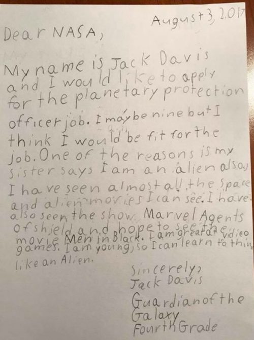 Nakon što su raspisali konkurs za poziciju službenika za zaštitu planete, NASA je dobila bezbroj prijava za posao, ali nijedna nije originalna kao ona koju je poslao Džek Dejvis, devetogodišnjak koji se predstavio kao Čuvar galaksije.