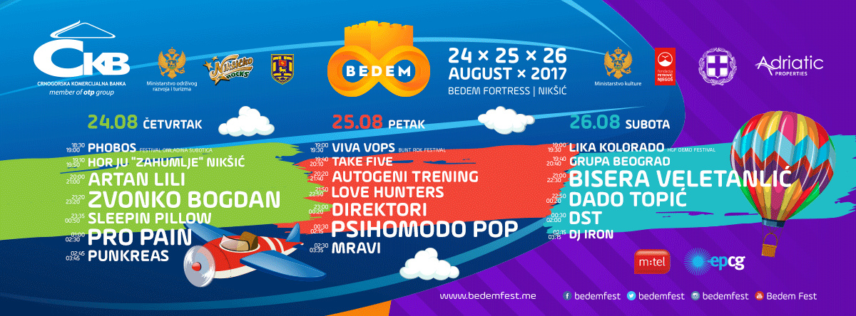 Dugo iščekivano osmo izdanje Bedem festa počinje sjutra. Prelijepim ambijentom Bedema u Nikšiću pronosiće se prve večeri zvuci ,,Phobos”-a (18.30 h), hora JU ,,Zahumlje” (19.10 h), ,,Artan Lili” (20 h), Zvonka Bogdana (21.20 h), ,,Sleepin pillow”-a (23.35 h), ,,Pro pain”-a (01 h) i ,,Punkreas”-a (02.45 h).
